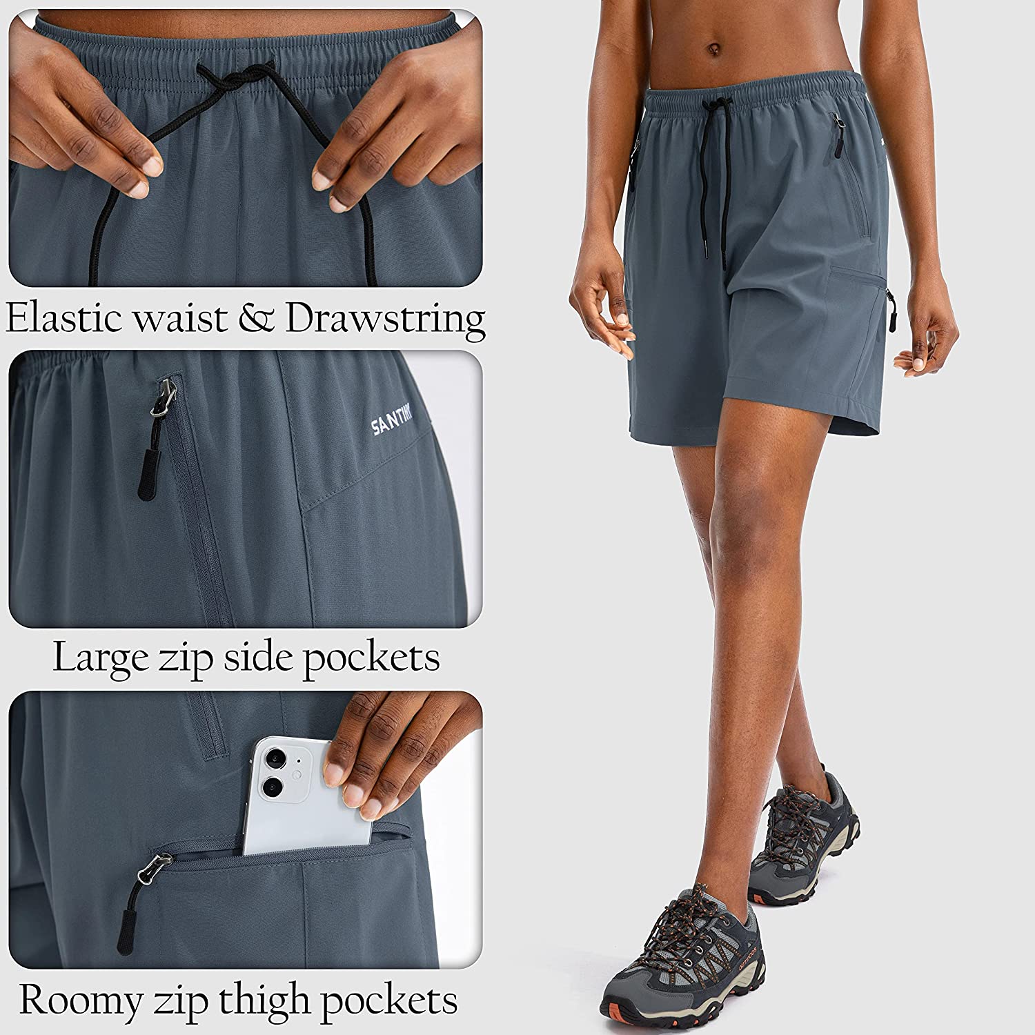 • Elastic Waistband: The Santiny womens cargo shorts have a 360-degree elastic waist with adjustable drawstring to prevent pressure marks on the tummy and offers a custom fit during hiking.