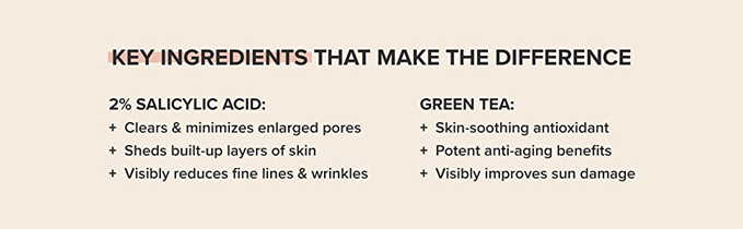 TARGET LARGE, CLOGGED PORES: 2% BHA (beta hydroxy acid or salicylic acid), gently unclogs & diminishes enlarged pores by shedding old, clogging buildup & dead skin cells.