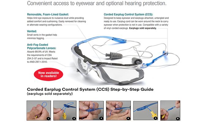 3M Virtua CCS Protective Eyewear with foam gasket features a comfortable seal that helps limit eye exposure to nuisance dust while providing additional cushioning. The anti-fog lens coating and removable foam-lined gasket with airflow vents make this protective eyewear ideal for humid environments. The versatile Corded Ear Plug Control System (CCS) design helps keep safety glasses and ear plugs attached (sold separately), untangled and ready to use, so your team has the convenient, comfortable protection it needs to focus on the jobs at hand. Anti-Fog polycarbonate lens absorb 99.9% UV. Meets the requirements of CSA Z94.3 and is impact rated to ANSI Z87.1 2015. Disclaimer: 3M industrial and occupational products are intended, labeled, and packaged for sale to trained industrial and occupational customers for workplace use. Unless specifically stated otherwise on the applicable product packaging or literature, these products are not intended, labeled, or packaged for sale to or use by consumers (e.g., for home, personal, primary or secondary school, recreational/sporting, or other uses not described in the applicable product packaging or literature), and must be selected and used in compliance with applicable health and safety regulations and standards (e.g., U.S. OSHA, ANSI), as well as all product literature, user instructions, warnings, and limitations. Misuse of 3M industrial and occupational products may result in injury, sickness, or death. For help with product selection and use, consult your on-site safety professional, industrial hygienist, or other subject matter expert.