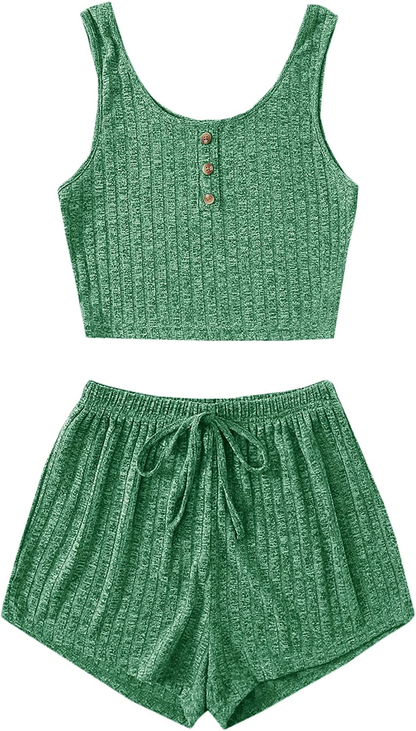 SheIn Women's 2 Piece Sleeveless Button Crop Tank Tops and Shorts Lounge Set