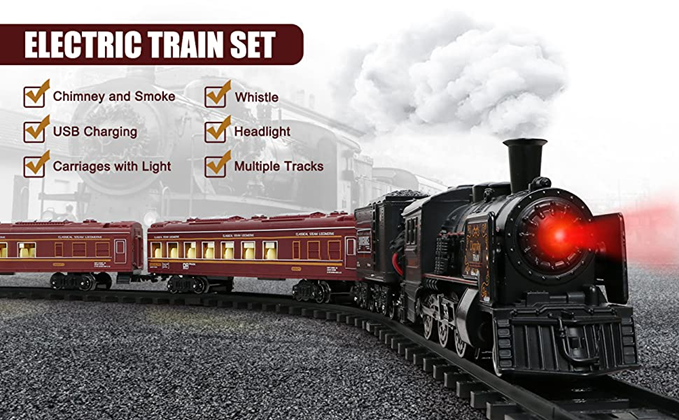 - ?【UPGRADED USB RECHARGEABLE ALLOY TRAIN TOY】:This train set comes with a full alloy steam train ,1 coal carriage and 2 passenger carriages with lights, 8pcs curved tracks and 6pcs straight tracks. Different from other train sets on the market,our train toys have a 1000mAh/3.7V rechargeable lithium battery and a USB charging cable as well as realistic lighting carriages.When fully charged, your child can enjoy hours of enjoyable travel.Tips:The train track size : 5 cm/1.96 in.