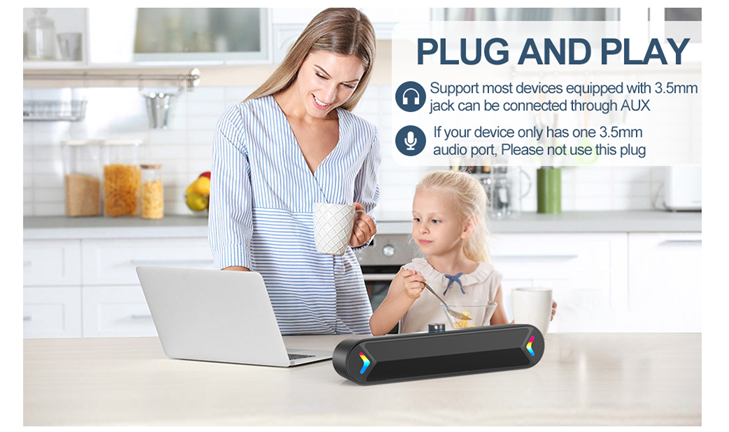 - Colorful Breathlight Design:Colorful light is perfect for your homes, offices and workspaces to enhanced happy atmosphere.You can turn on/off the light by the control button on the sound bar.