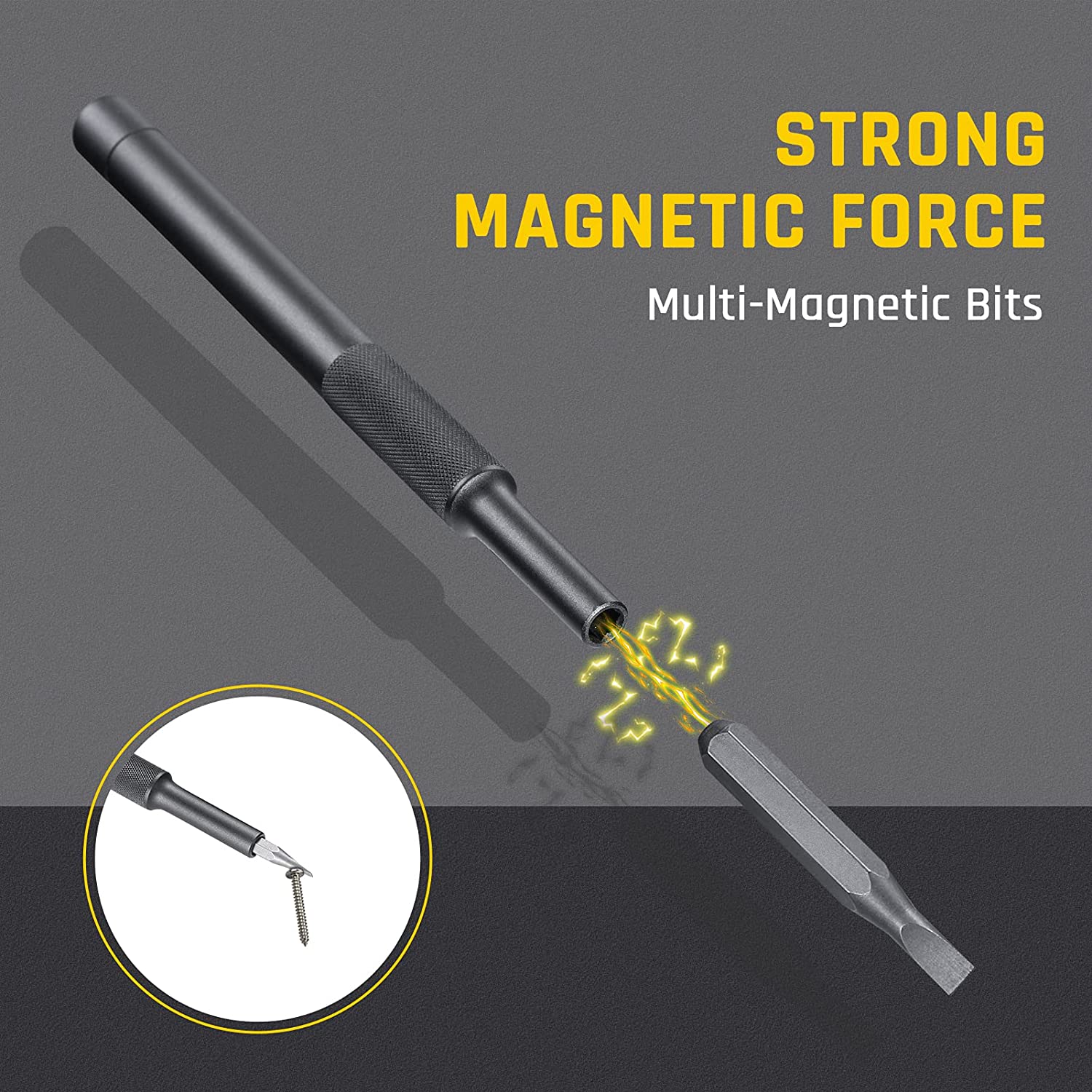 - Magnetic Storage Box: Built-in ejection button, one-click pop-up bits container, more convenient for you to take out and lock the bits container. Magnetic box helps hold all the screws in place so that they do not fall off. Now you never have to worry about losing the bits. The head of the screwdriver shaft has also a built-in strong magnet, which makes it easy to install the bit, the magnetic screwdriver bits can also easily suck up small screws.