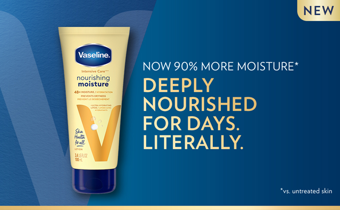 Vaseline Intensive Care Essential Healing is now Vaseline Intensive Care Nourishing Moisture. Vaseline Intensive Care Nourishing Moisture lotion locks in moisture and deeply nourishes for healthy-looking skin. This body lotion is formulated with Pure Oat Extract and Ultra-Hydrating Lipids that fortify the skin barrier and replenish moisture. With daily exposure to environmental triggers (like wind, lack of humidity, and sun), skin's natural moisture barrier can break down, allowing for water to escape the skin. But the Ultra-Hydrating lipids in our lotion fortify the skin barrier and replenish moisture to allow the skin's natural barrier to recover. This lotion locks in moisture and promotes smooth, naturally glowing skin. The body moisturizer is clinically tested to provide 90% more skin moisture (vs. untreated skin). This body lotion for dry skin absorbs fast for rich moisturization without the residue and provides 48-hour moisture. Use this dermatologist-tested body lotion daily on dry, rough skin for stronger, noticeably healthy skin. Just apply to your skin for hydrating relief. This Vaseline lotion bottle is made of 50% recycled plastic. Our ambition is to get to 100% recycled plastic in the near future.