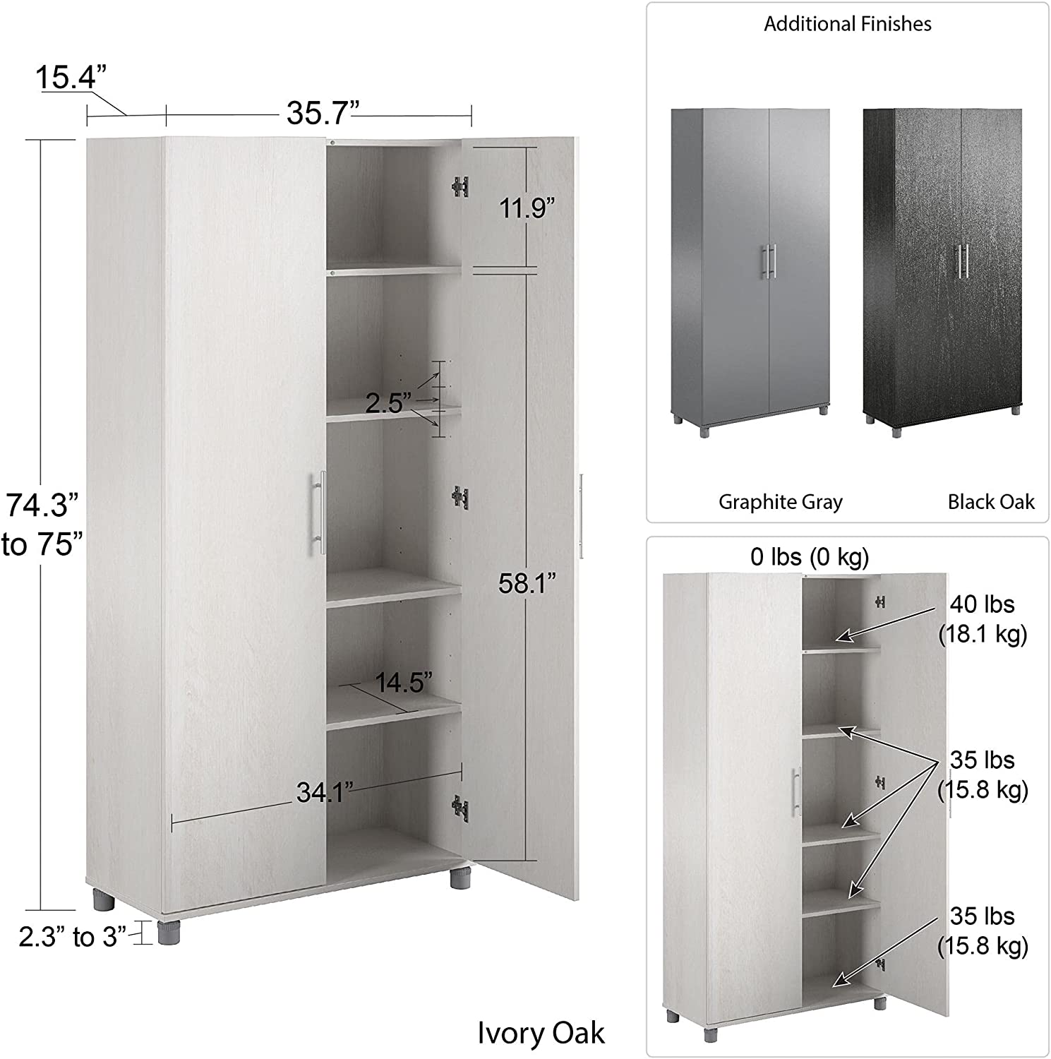 • The Storage Cabinet ships flat to your door and 2 adults are recommended to assemble. Each shelf will hold up to 35 lbs. Assembled dimensions: 74.31”H x 35.68”W x 15.38”D