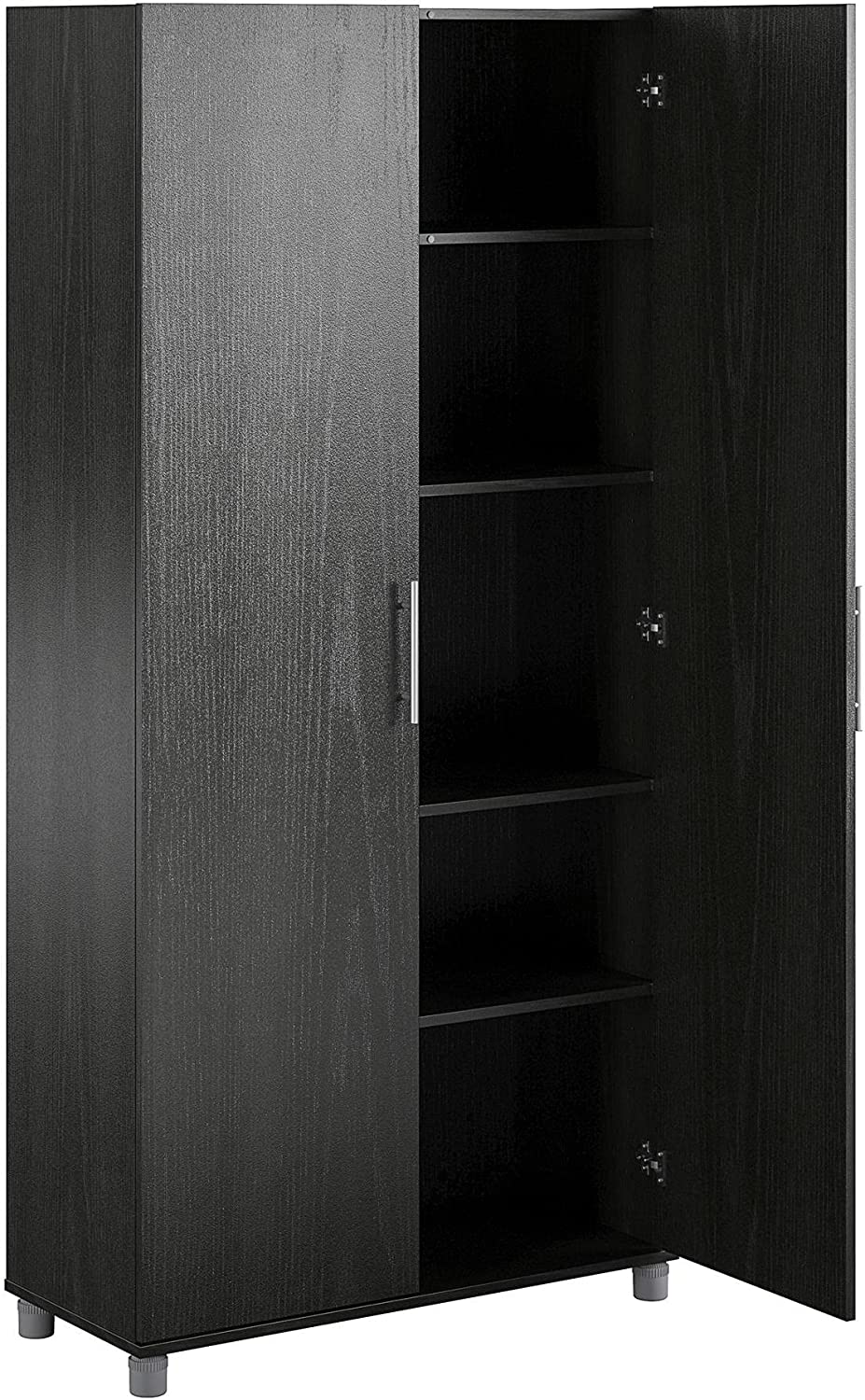 • The 5 shelves, 3 adjustable, can store and organize your cleaning supplies and even kitchen pantry items. Adjustable feet keep your Cabinet level on uneven floors