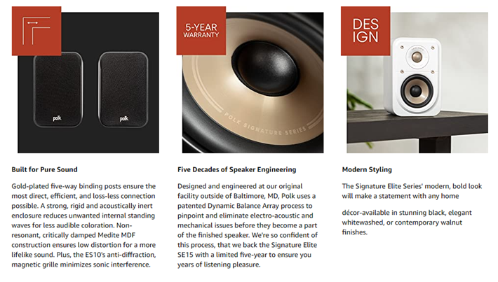 Enjoy movies, gaming, and multi-channel music in high-resolution cinematic sound with Polk’s full-range ES10 wall-mountable, compact surround loudspeaker. Featuring a Dynamically Balanced acoustic array with a 1” High-Resolution Terylene Tweeter, a 4” Mica-Fortified Polypropylene Woofer, and Precision Crossovers, the ES10 delivers crystal-clear, highly detailed sound with the energy of live music – no matter what you’re listening to or where you’re sitting in the room. Polk’s Patented Power Port Bass Enhancing Technology extends the overall bass port and provides greater surface area for distortion-free, louder bass impact. It is Hi-Res Audio Certified and ensures accurate sound reproduction from even the latest Dolby Atmos and DTS:X surround sound AVRs and amplifiers. The Signature Elite Series is designed with quality, timbre-matched Polk components to enable you to mix and match models and build your dream home theater or music listening environment. Add the Signature Elite ES60 tower pair, ES35 center channel and any sub for a complete 5.1 surround setup.