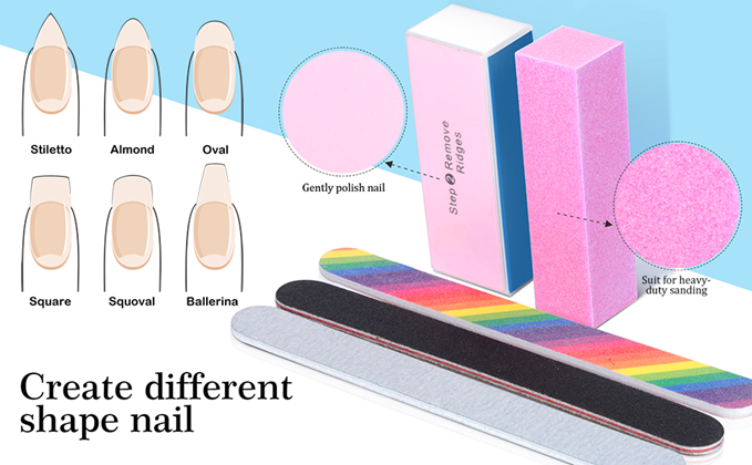 3pcs nail file and 2pcs sponge block perfectly trim and shape your nail and create different nail style, fashion and beautiful.