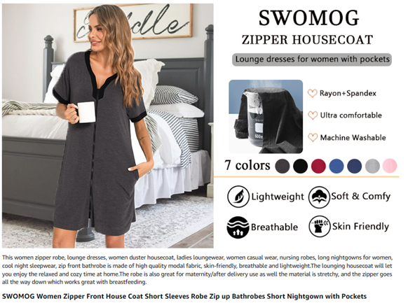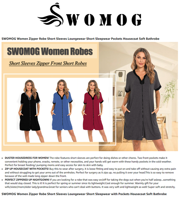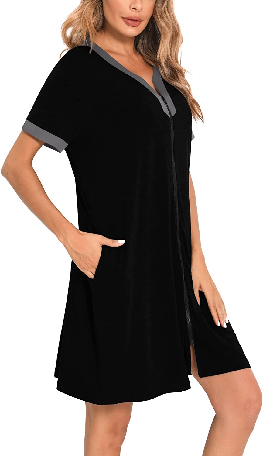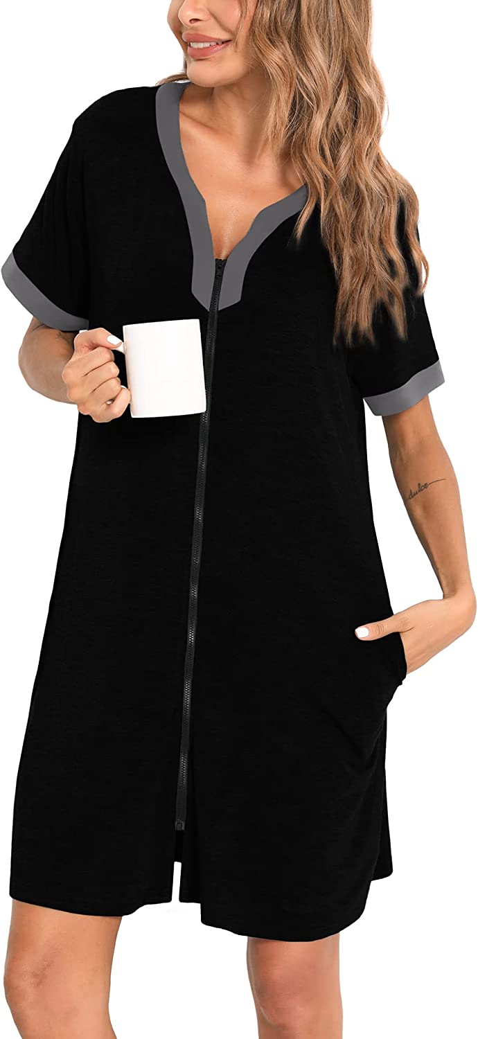 SWOMOG Women Zipper Front House Coat Short Sleeves Robe Zip up Bathrobes Short Nightgown with Pockets