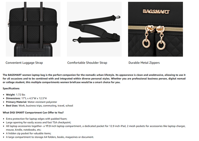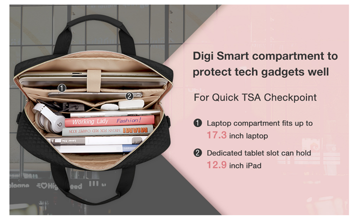 • TSA FRIENDLY- Convenient at checkpoint. A separate tech compartment with large opening design can make you quickly pass at airport security, and three pockets in main compartment also keep your tech gadgets tidy.