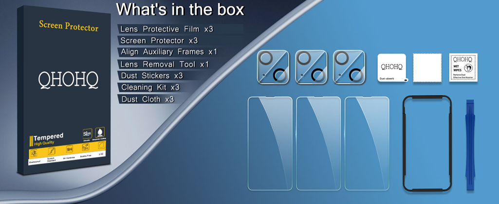 - [Easiest Installation and Removal]: QHOHQ screen cover comes with installation alignment frame to ensure quick and accurate installation without any air bubbles and incline. It's also equipped with a camera lens protector easy removal tool to easily remove it without damaging the phone lens or your fingers. Please watch our screen saver installation video tutorial before installation to make sure it correct. Please clean off the dust on the surface of the screen before actual installation.