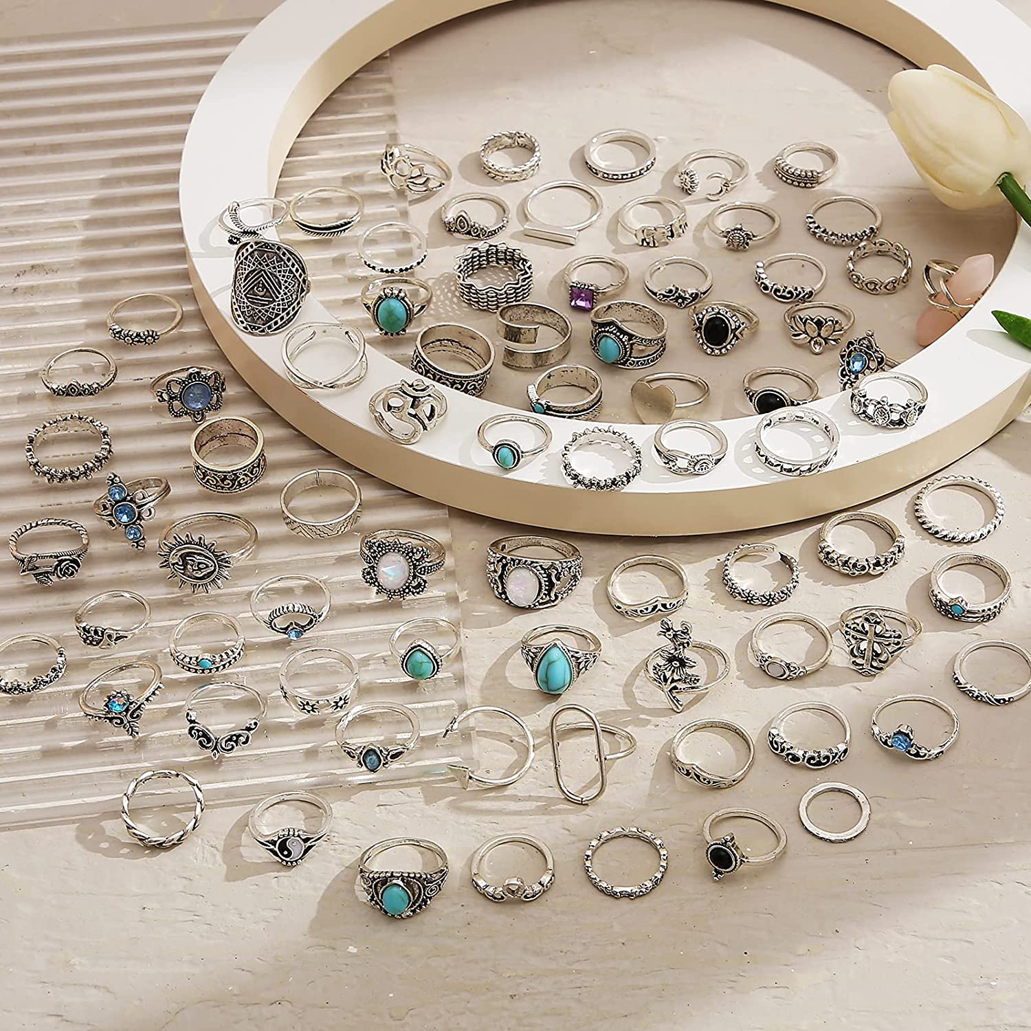 ❤82 Pcs Ring Pack❤ You will get a set of 82 different designed rings, which contain turquoise stones, crystals, black stones, etc. You can choose different sizes of rings to wear on your different fingers. Various styles can match various clothing and occasions.
