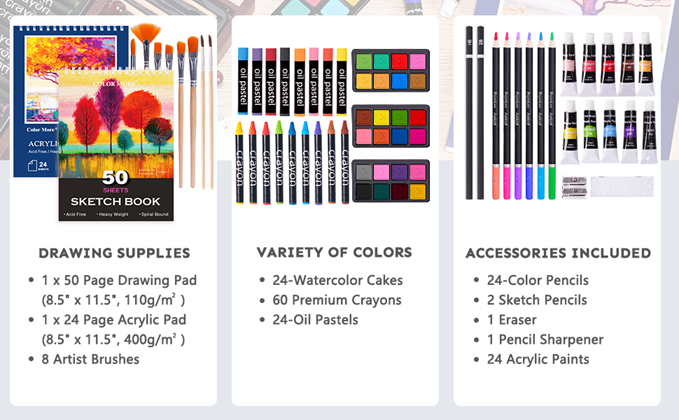 ✅ QUALITY GUARANTEE: Color More Art Supplies represents superior quality and customer service with your highest satisfaction . We are confident you will enjoy these art sets, complete with all other items the artist needs.