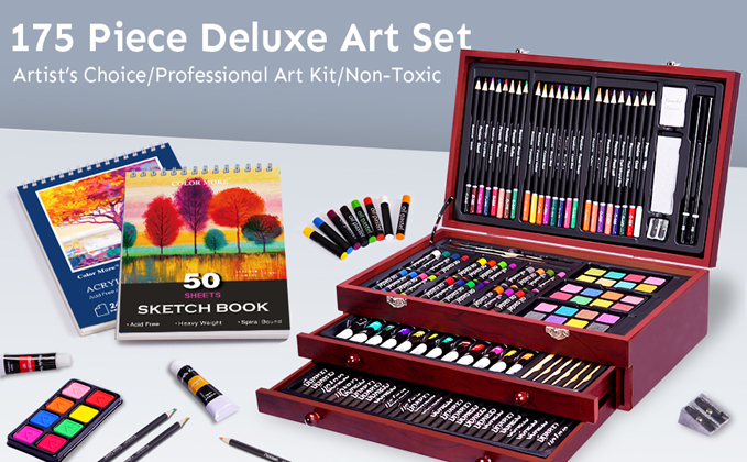 175 Piece Deluxe Art Set with 2 Drawing Pads, Acrylic Paints,Crayons,Colored Pencils,Paint Set in Wooden Case,Professional Art Kit,Art Supplies for Adults,Teens and Artist,Paint Supplies