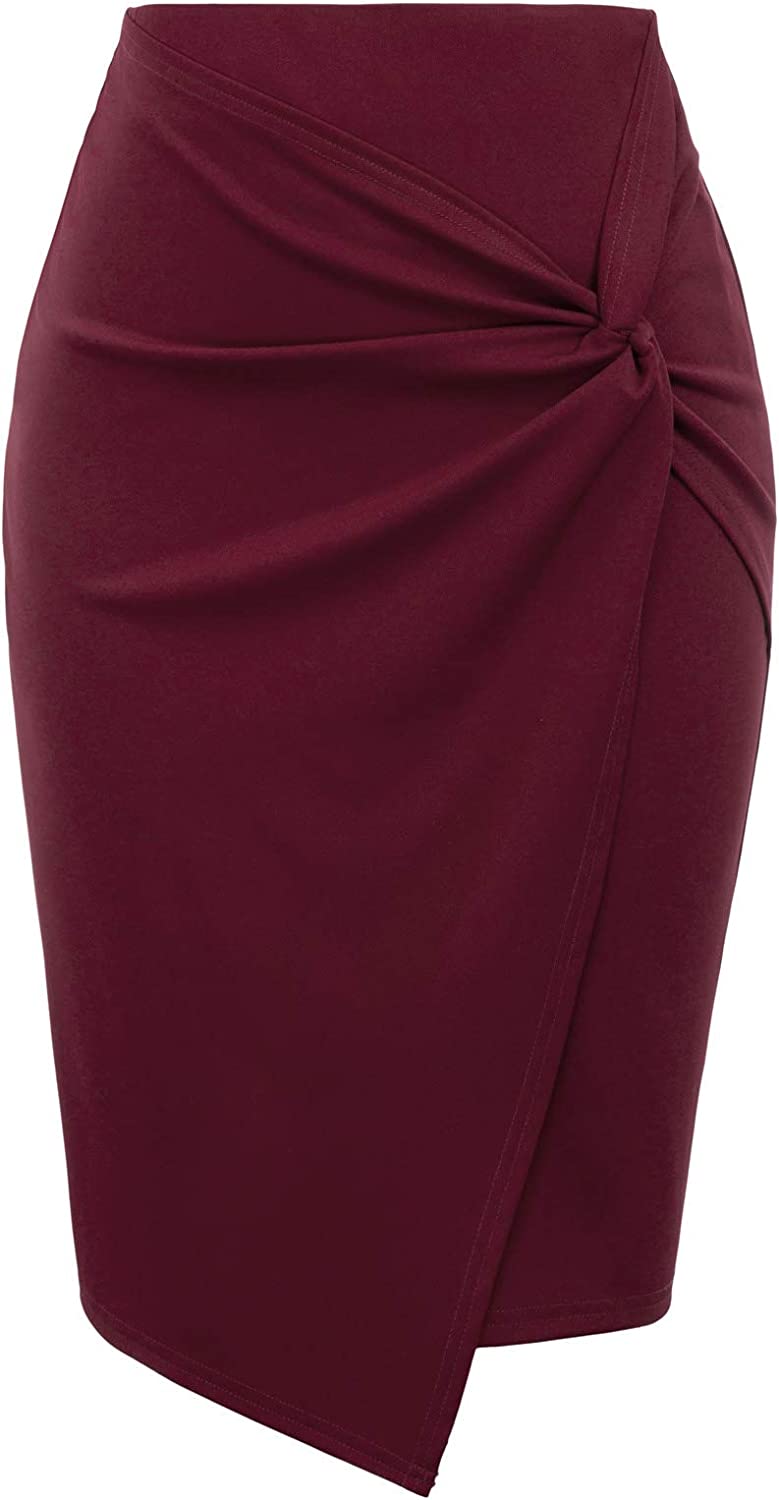 FEATURES: Asymmetrical Wrap Front with concealed zipper in the back.Well elastic pencil skirt