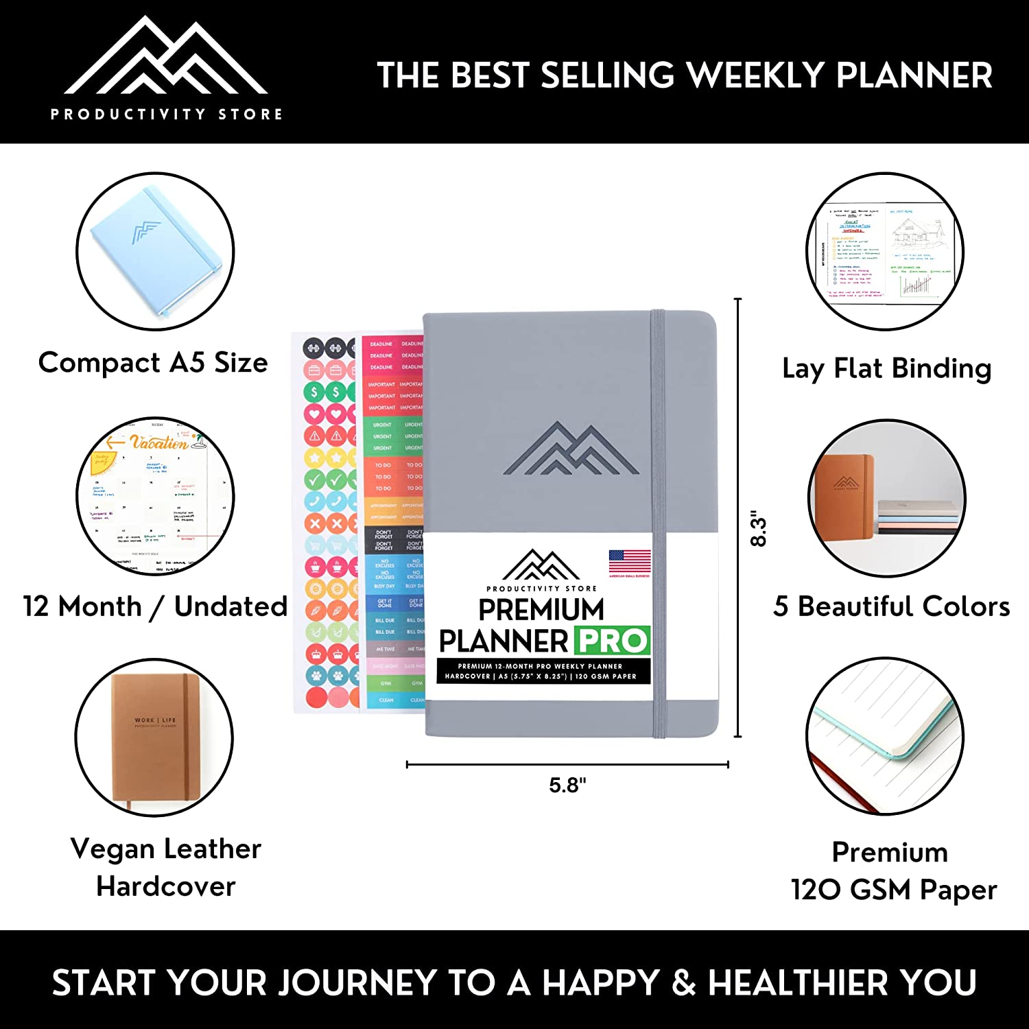 Best 2023 Planner Weekly and Monthly 5x8 | Goal, Business & Productivity Planner | Undated Daily 2023 Planner With To Do List, Habit Tracker & Planner Stickers | Productivity Store Planner PRO (Grey)