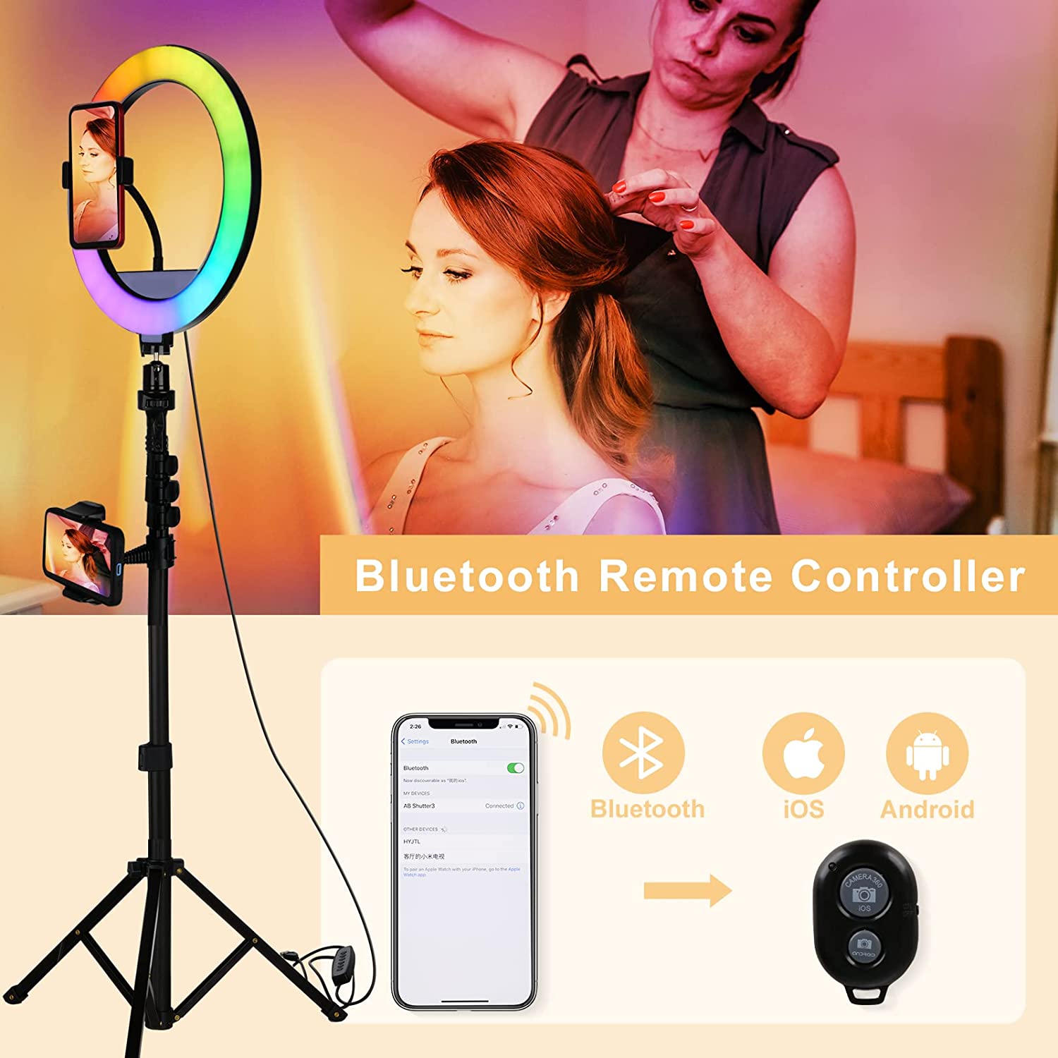 • 【Compatible with Most Smart Phones】Colored Ring Light with Stand and Phone Holder(adjust from 2.8-4")is suitable for most smart phones.By using the bluetooth remote controller, you can easily control your smart phone to take selfies or group photos.