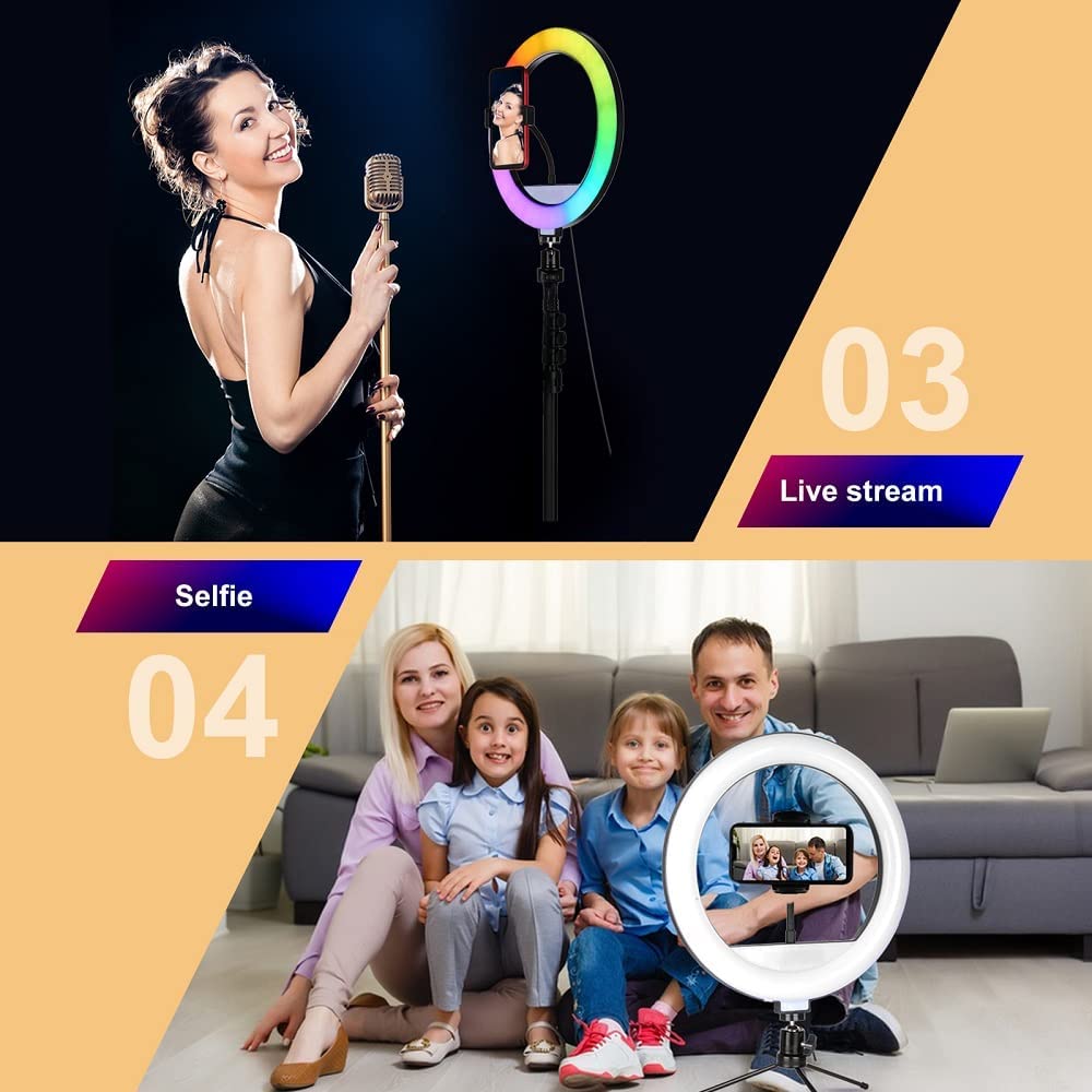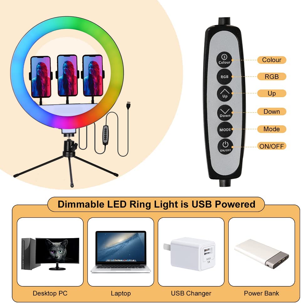 • 【Color Ring Lights USB Powered】Phone Ring Light Tripod is USB powered and works with most devices that support USB port, like laptop, PC, power bank, USB chargerand etc.34 color modes Tik Tok Light Ring with stand for YouTube Video Vlog TikTok Suitable iPhone Android Camera.