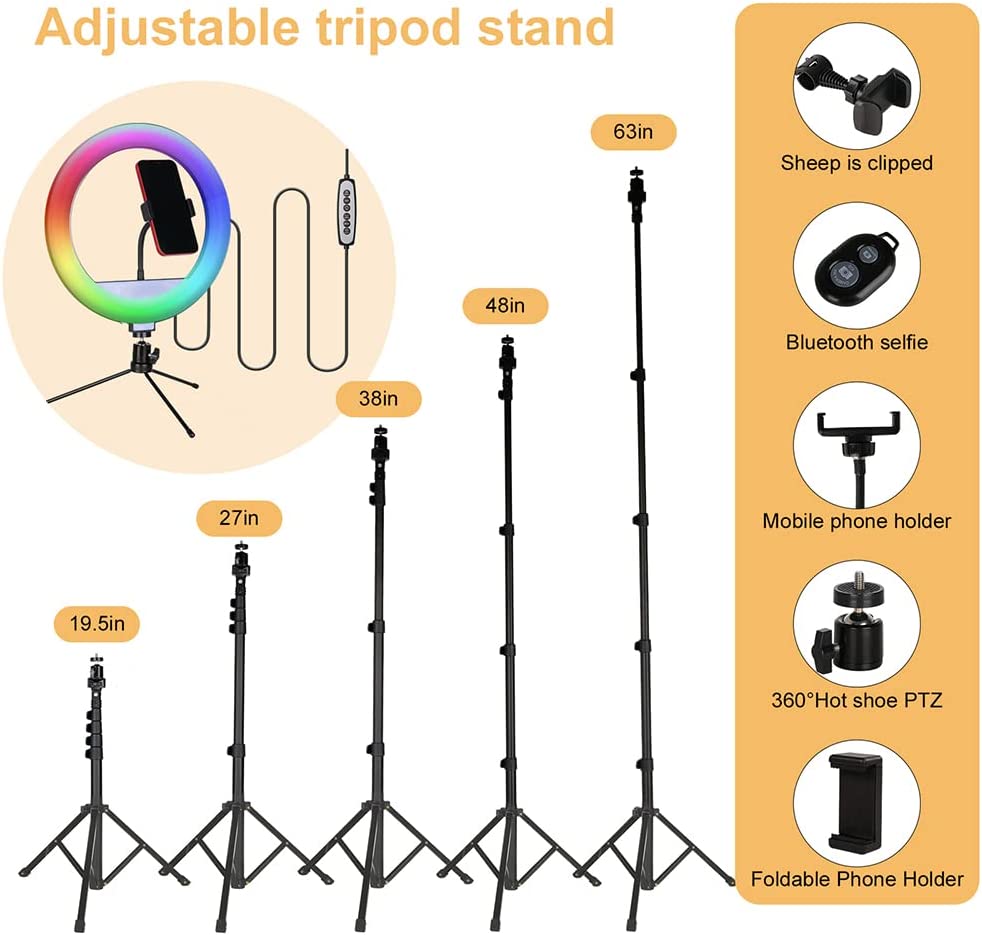 • 【Floor/Tabletop Ring Light Tripod】The Cell Phone Tripod and Ring Light height is extendable from 19.3" to 63",that is made of high-quality aluminum alloy.We offer another mini tabletop tripod as you preferred.