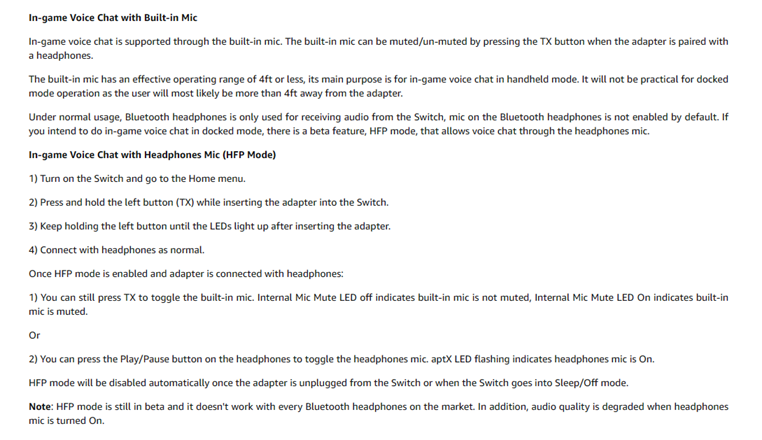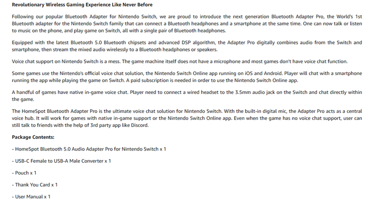 • [Voice Chat for ALL Games] The HomeSpot Bluetooth Adapter Pro let you talk and play at the same time. No matter what voice chat technology a game uses, either native in-game voice chat, or Nintendo Online App, or even when the game has no voice chat support. Equipped with a built-in mic, voice chat can be done for ALL Nintendo Switch games.