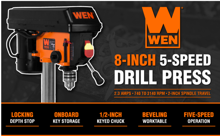Remember when you could drill with maximum accuracy? Power through metal, wood, plastics, and more with the WEN 8-Inch 5-Speed Drill Press. Don’t let our compact design fool you. Between the five operating speeds, the two-inch spindle travel, and the sturdy construction, you’ll have way more precision than a standard handheld drill. Our 2.3-amp induction motor features ball bearings for smooth balanced performance even at high speed. Manually set your speed to either 740, 1100, 1530, 2100, or 3140 RPM by adjusting the belt position on the two spindles. The easy-to-read, locking depth stop allows for accurate and repeatable drilling operations. The keyed chuck with JT33 spindle taper accepts bits ranging from 1/20 to 1/2 inch in diameter (1.5 to 13 mm). The table bevels 45° left and right for angled drilling. The base is designed with holes for mounting onto a bench or work stand. Clamps and vises are easily mounted to the slotted table, making work-holding safe and effective. And because its a WEN product. a stocked inventory of replacement parts, and a helpful customer phone line. Remember when you could drill holes in almost anything? Remember WEN.