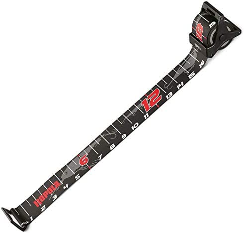 Rapala 60" Retractable ruler features: - spring loaded retractable ruler for easy storage - oversized, easy to read numbers, in 1/2" Increments up to 60" - non-reflective surface ensures length shows in photos - made from a long-lasting, UV protected, waterproof material - Flip-up nose board for accurate measuring