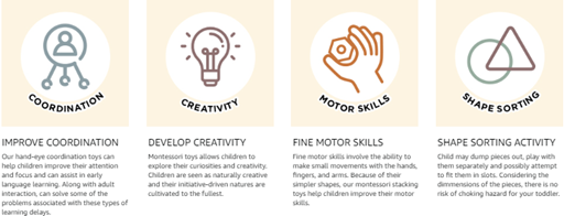 - ? MULTI-SENSORY DEVELOPMENT - Our montessori developmental stacking toy it’s an easy game that involves mounting one piece on top of the another piece. The geometric blocks have the same size but different colors and shapes. While stacking the blocks, children need to sit and balance core muscles to move hands freely and figure out which shape fits where. This kind of activity will help your toddler to control his body movements which are in coordination with the stacking and sorting activity!