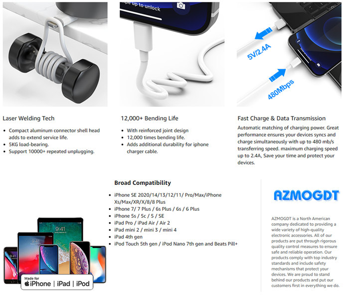 AZMOGDT lightning cable set is designed for safe and fast charging , an ideal buddy for office, game, daily life, outdoor, long distance journey & business trip.