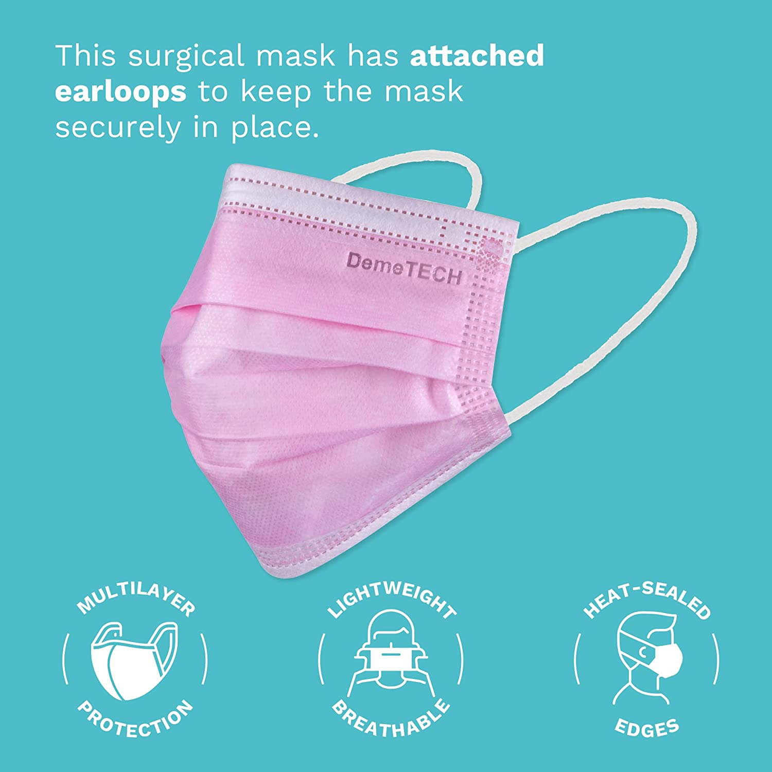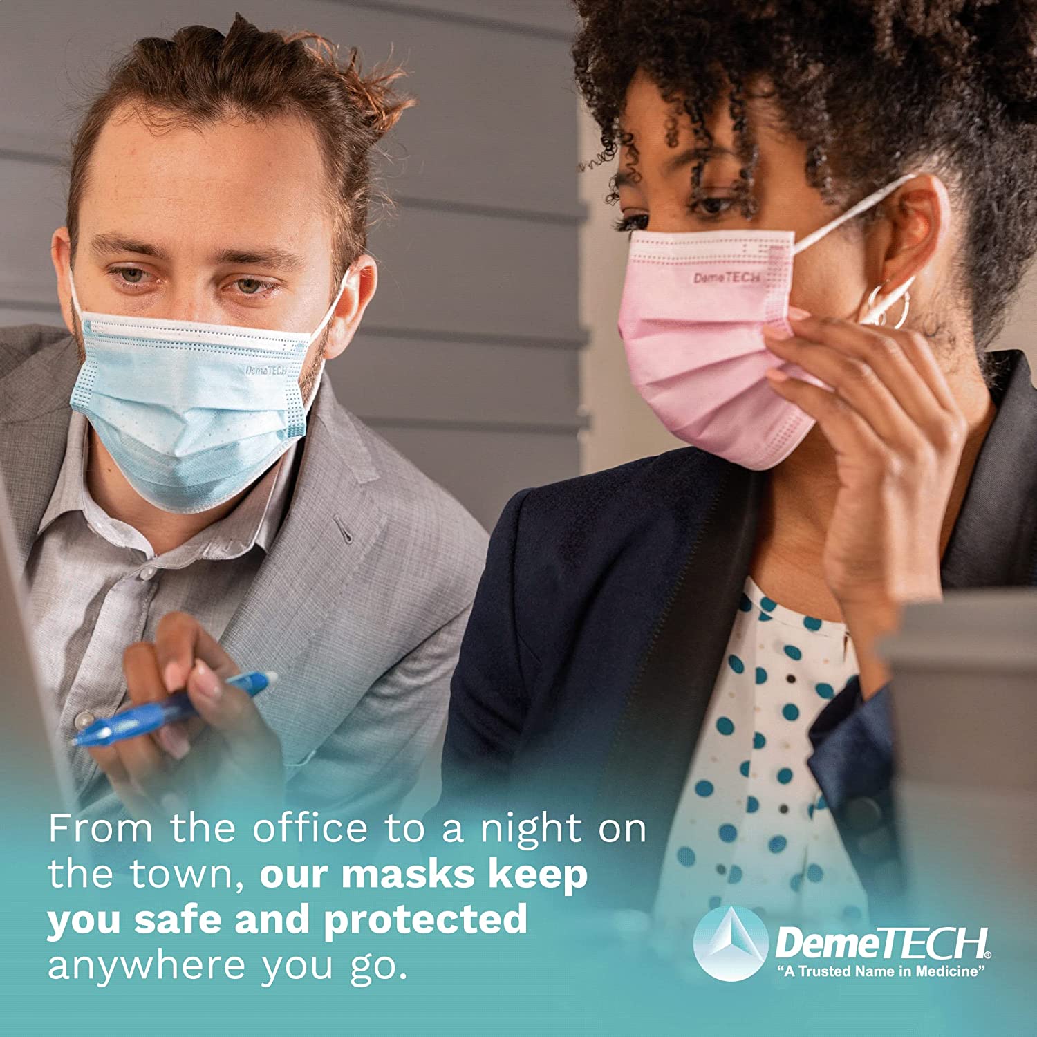 Protective 3-Layer Box of 50 Adult Disposable Face Mask with Ear Loops, Made in the USA, DemeTECH