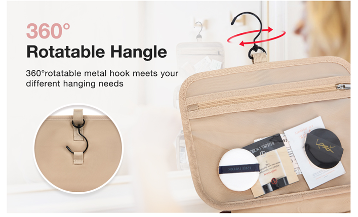 Special Design - 1 front zipper pocket for storing makeup brushes and cosmetics. Detachable shoulder strap provides a variety of ways to carry. Stow-away 360 degree swivel non-slip metal hook for versatile hanging options.