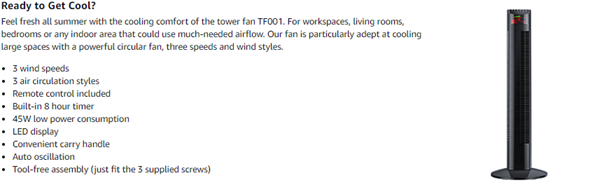 | Included Components | LargeTower Fan, Remote Control, Use Guide |