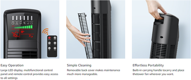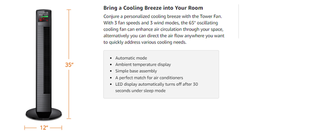 - 65° Oscillation For Wider Air Distribution: Coming with a 65° oscillation feature, the tower fan is able to offer a wider airflow and increase its cooling effects, so it can provide a refreshing experience to your entire family. For even better results and less energy waste, you can pair your fan with your air conditioner to accelerate the air ventilation and attain a more balanced room temperature.