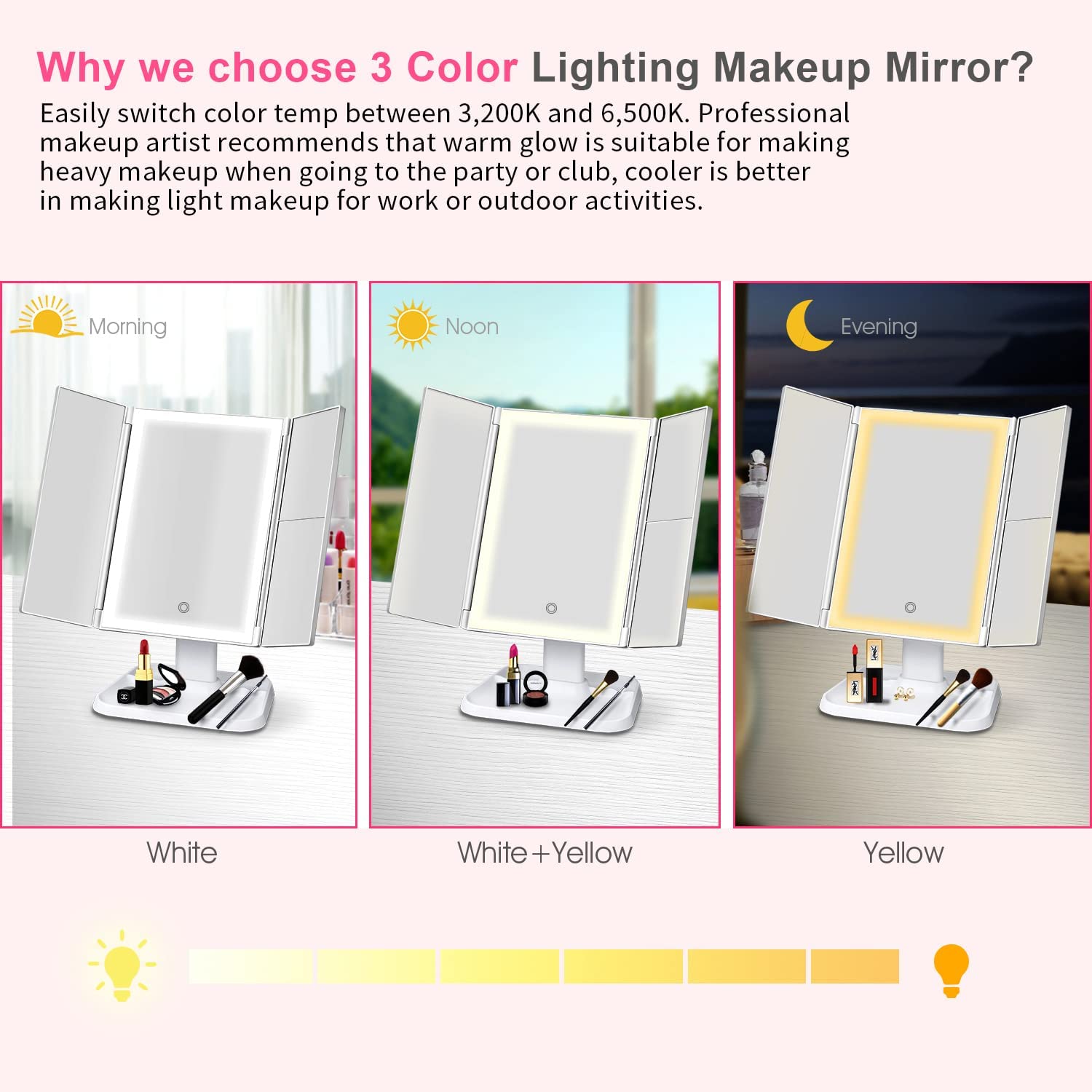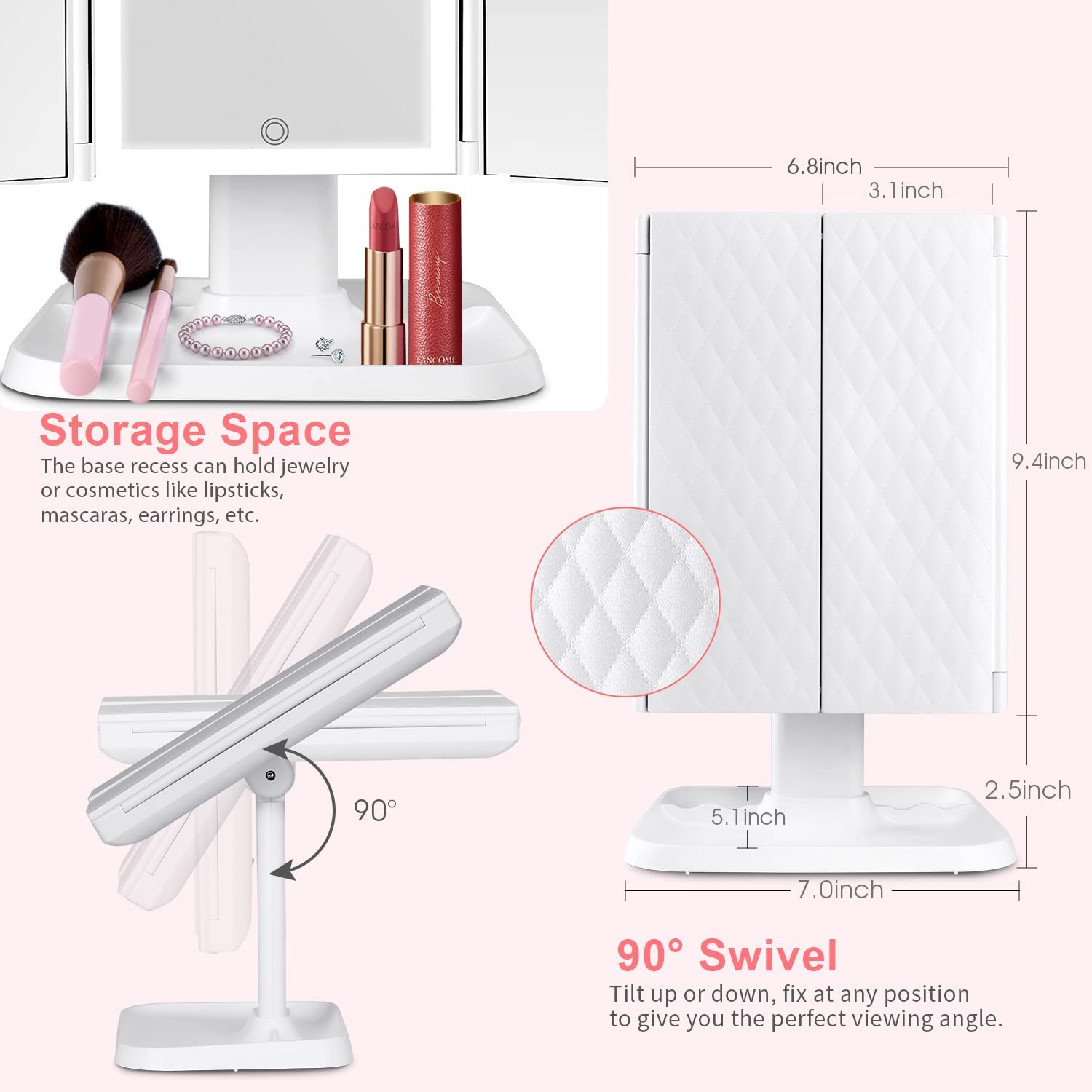 This makeup mirror features 72 LEDs that deliver bright and eye-friendly lights in warm, cool, or natural color mode. The trifold design and 1X/2X/3X magnifying mirrors let you see all your face clearly so as to apply exquisite & precise makeup. The humanized design, such as the storage panel, 90° swivel, and leather-like texture, adds convenience and decoration for your usage. Apply better makeups from now on with the exquisite mirror. Product Features