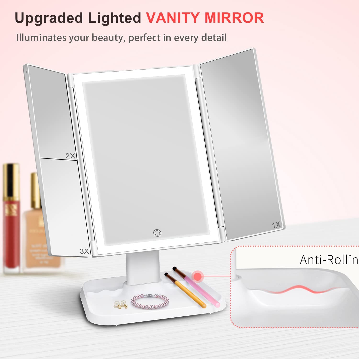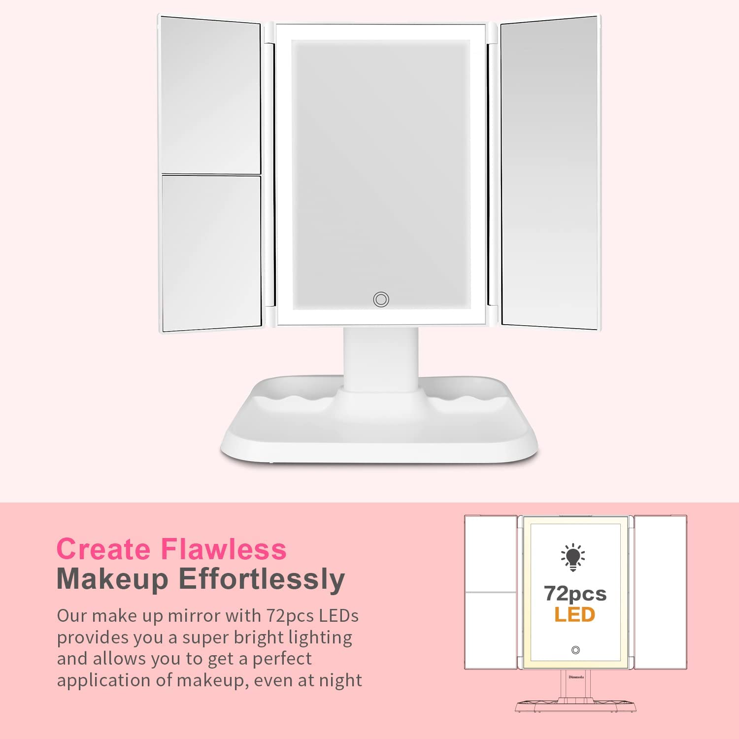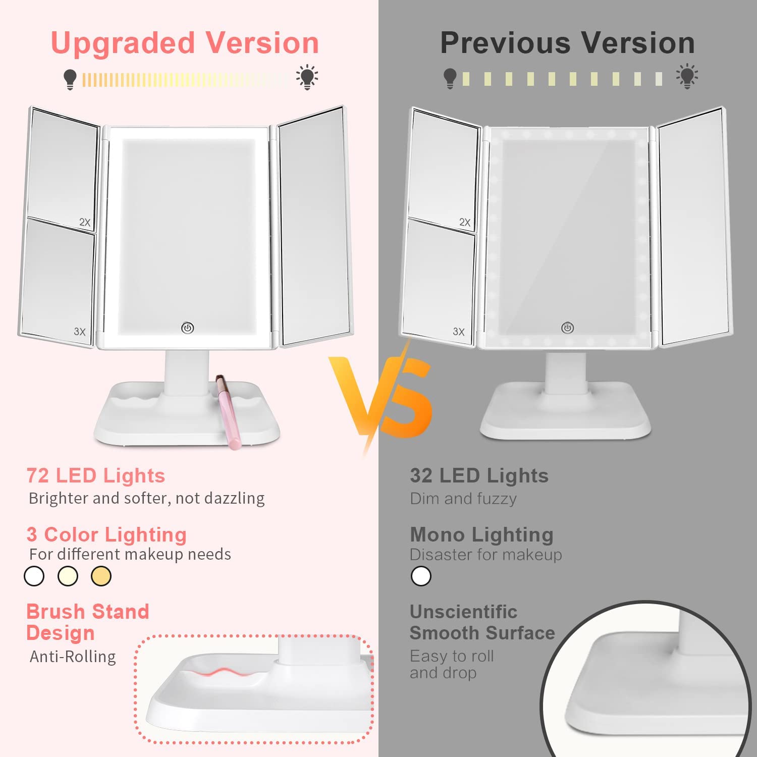 Makeup Mirror 72 LED Mirror 3 Color Lighting Modes, 1x/2x/3x Magnification, Touch Control Design, Portable High Definition Cosmetic Lighted Up Mirror