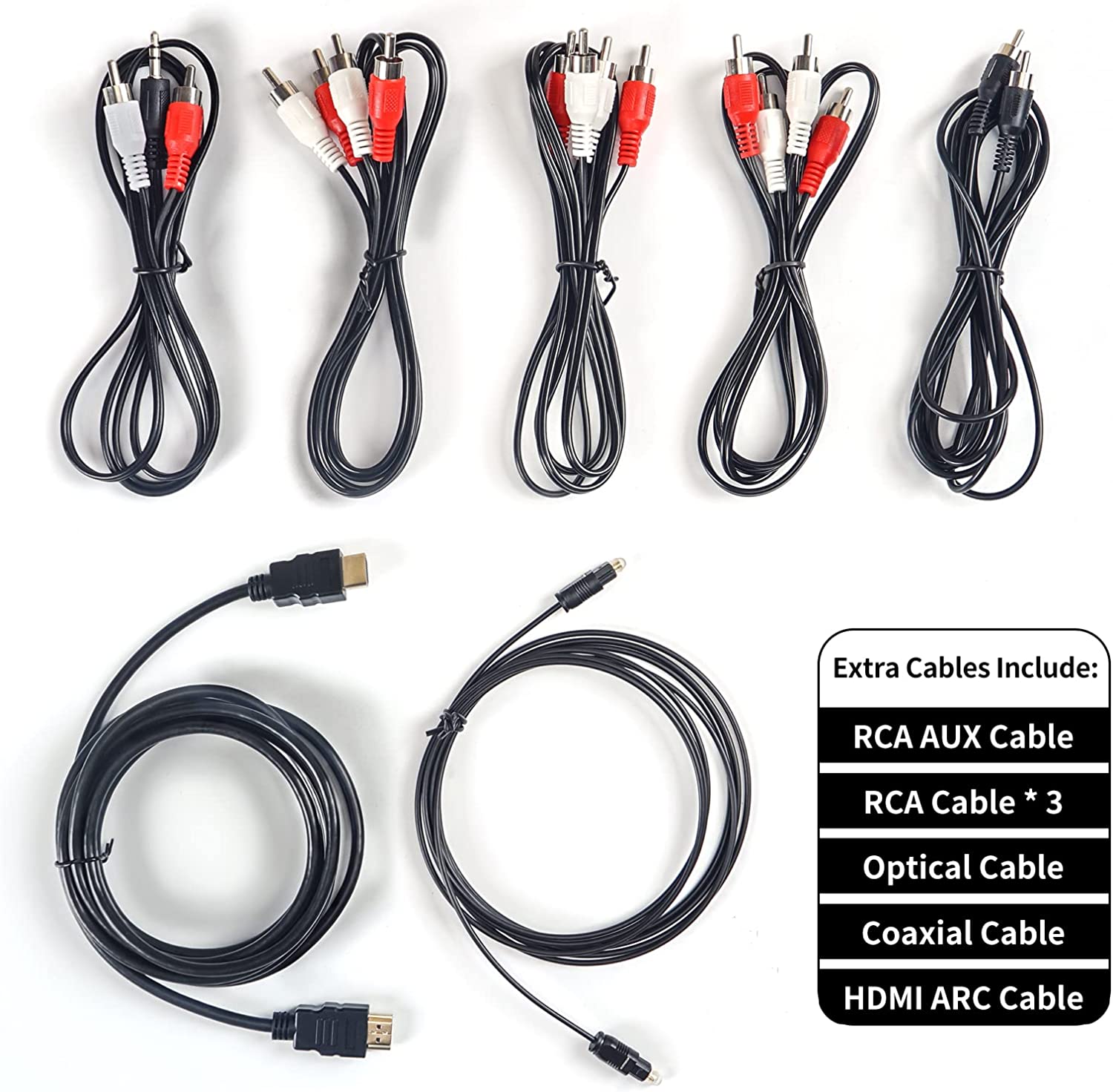 - Multimedia Support: The home surround sound speakers support various smart devices. 5.0 Bluetooth supports directly connecting with Bluetooth devices; It's also compatible with HDMI/OPT/COA/AUX/USB/DVD audio sound inputs. Additional cables include HDMI ARC Cable/Optical cable/Coaxial cable/AUX cable/RCA cable/Antenna cable supports any application in need