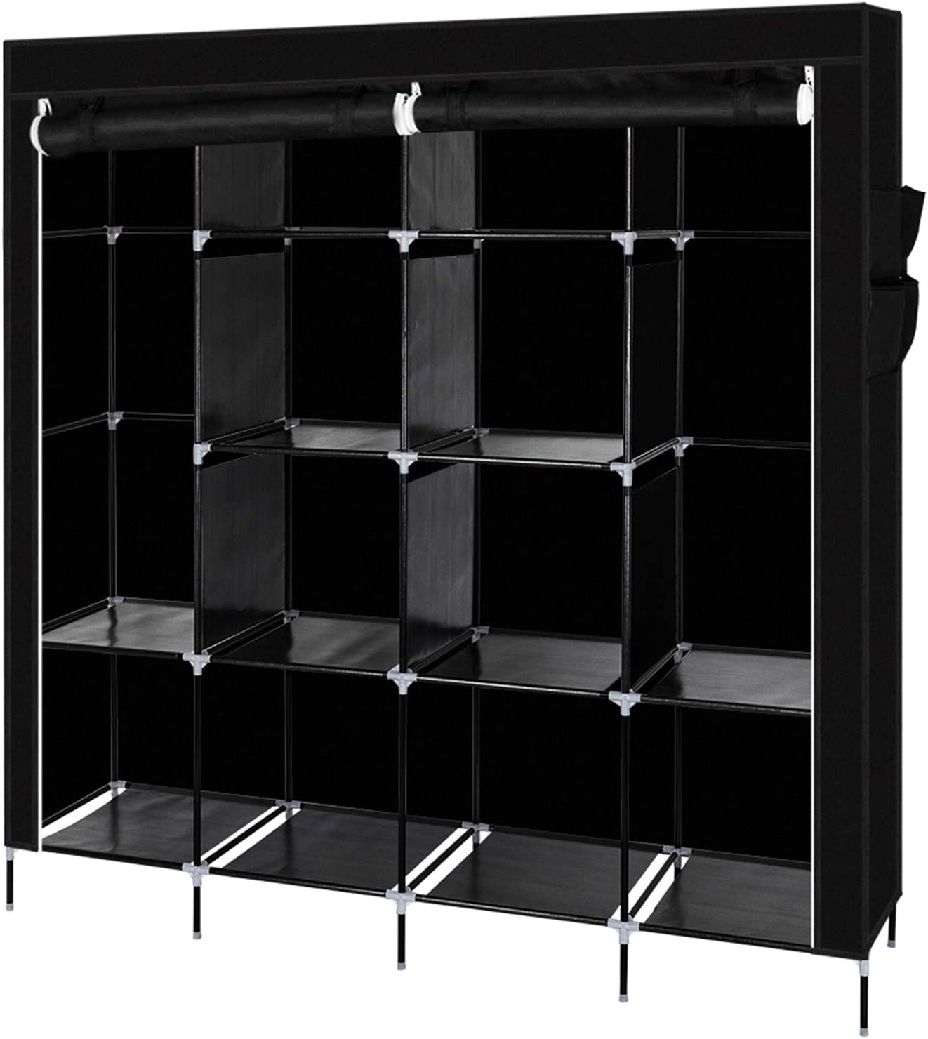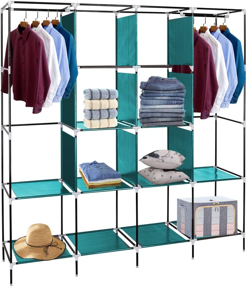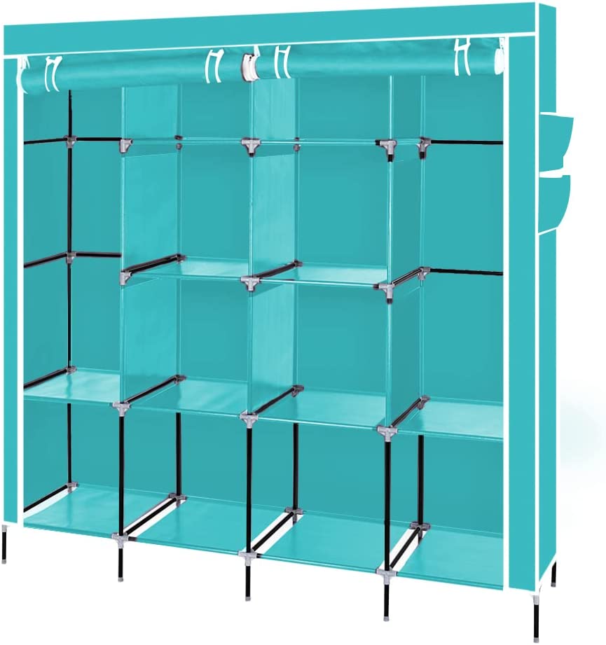 【SPACIOUS STORAGE SPACE】: The size of the portable closet wardrobe is 66x17x66/71 inches (with bottom bar), it comes with 1 removable clothes rail and 12 storage racks. Not only does this wardrobe provide extra space for your coats, dresses, sheets, folded clothes and more, it also meets your long-term storage needs.