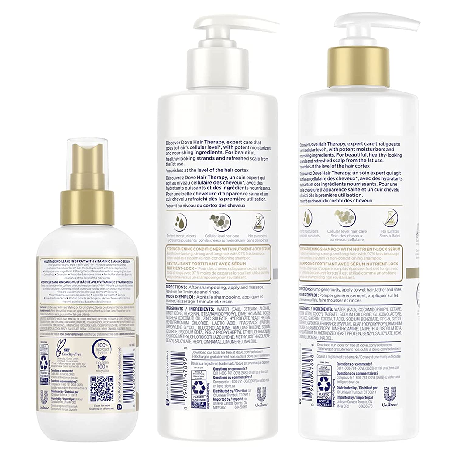 Wondering how to help make hair stronger and reduce hair breakage all at once? This Hair Therapy Regimen kit is for you. We are all about those good hair days – but hair breakage can make us feel less than our beautiful best. That’s why we created our Dove Hair Therapy Breakage Remedy Regimen System for damaged hair. Giving your hair the care it deserves, this strengthening regimen system blends all the care of Dove you know and love, with expert hair care for breakage. Made with our Nutrient-Lock serum, this Breakage Remedy system helps your hair look thicker, stronger, and healthier. Simply smooth it on to enjoy thicker-looking hair with 97 percent less breakage** – and say hello to good hair days every day. Perfect to remedy hair breakage. This strengthening regimen system is made with Nutrient-Lock serum, a mixture of dipeptides and conditioning actives, to help make hair stronger and reduce hair breakage. Gentle, nourishing hair care with a gentle, caring formula, this 3-step system (consisting of our Breakage Remedy shampoo, paraben-free conditioner, and a leave-in treatment) leaves you with beautiful, healthy-looking strands and a refreshed scalp from the first use. Being kinder to the planet: Dove Hair Therapy Breakage Remedy Regimen System has packaging made from 70 percent recycled plastic, so you can be kind to your hair and the environment. Our Hair Therapy range carries the PETA Cruelty-Free logo for added peace of mind. Globally, Dove does not test on animals and is certified Cruelty-Free by PETA.