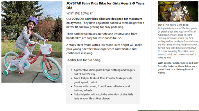 - Best Gift for Kids - This JOYSTAR Fairy girl's bike with 12-inch wheels is designed for children 2-4 years old or 33-41inches tall. The Fairy is perfect for riding to the park or riding on the sidewalk around the neighborhood.