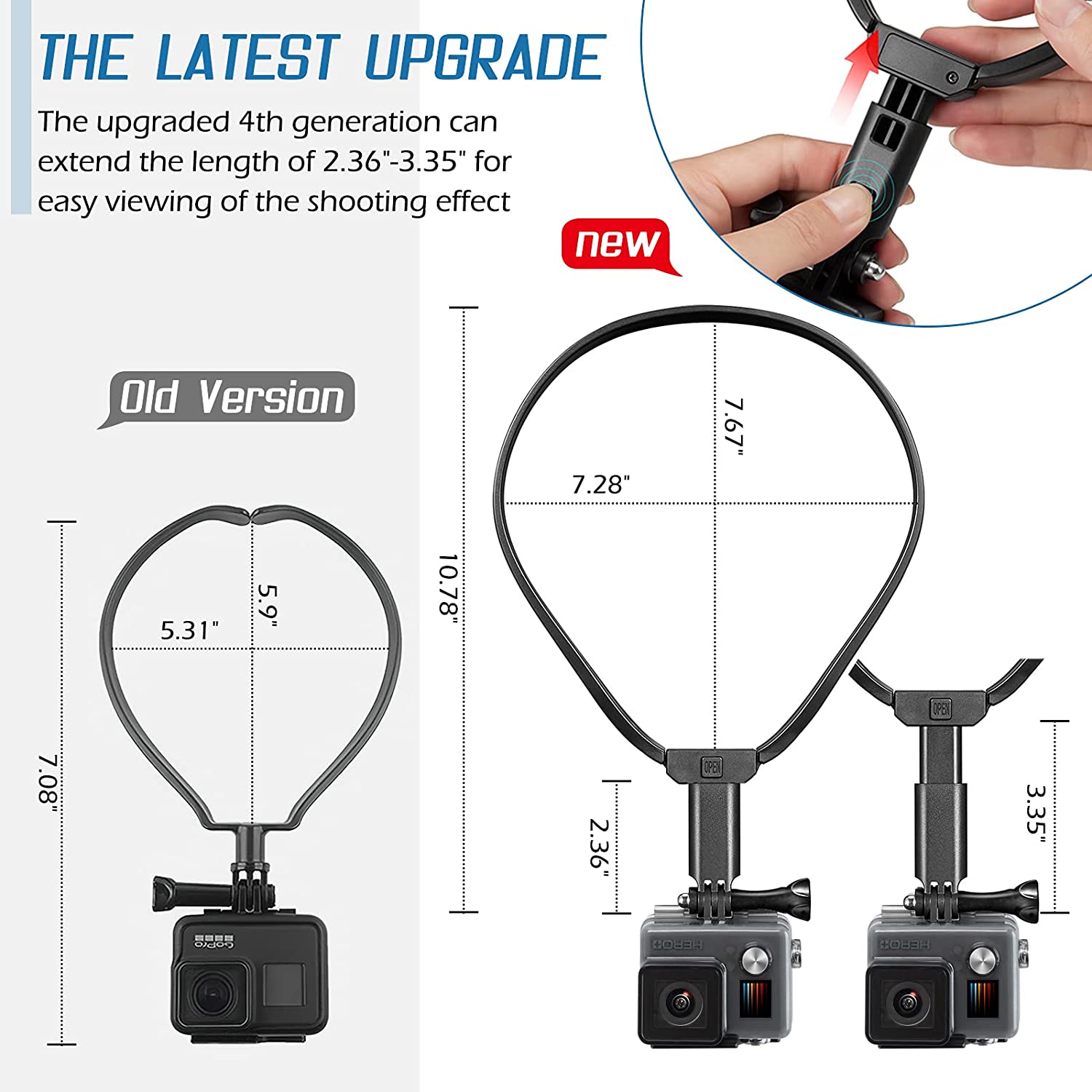 • ?【Upgraded phone Neck Holder Mount 2.0】: The newly upgraded retractable desig, neck holder phone attaching part can be extended from 2.36"(6cm) - 3.35"(8.5cm) for easy viewing of the shooting screen effect. Widen the size of the Neck Holder Mount to protect the player’s neck and make it more comfortable to wear. The pov camera mount is made of ABS environmentally friendly materials, making the product more durable and sturdy, with a ductility of up to 180°.