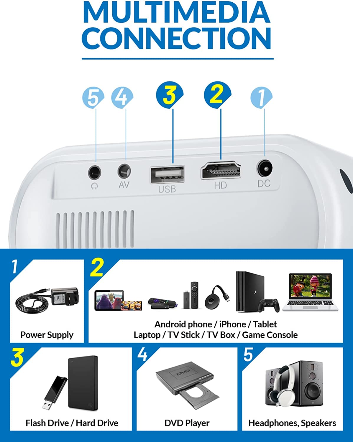 【Mini & Portable Projector】 This mini projector has a unique and elegant design with a size of 6.74x5.28x2.96 inches and a weight of 0.72 kg. It is small enough to fit in your bag. Moreover, there is a handle on the product box for carrying. Therefore, it is rather light and handy to carry when you go out.