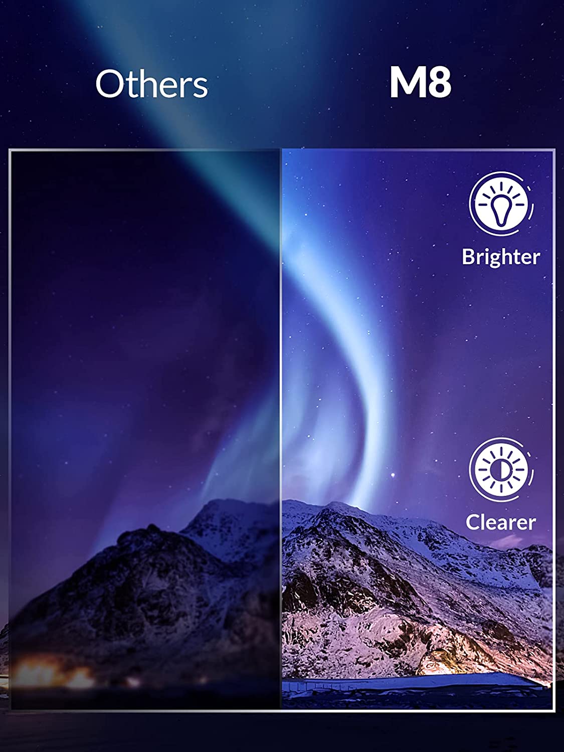 【2023 Upgrade Mini Projector】 Mini projector has 9000 Lux brightness and supports 1080P Full HD 30-180(Recommended for 60 -100 inches) inch display, adopting advanced LED technology and uniform illumination method, which make the edges of the projection brighter and clearer. These ensure the projection image quality presents a real, dynamic, and color-vibrant effect. The mini projector also applied diffuse reflection technology, protect your eyes away from tiredness.