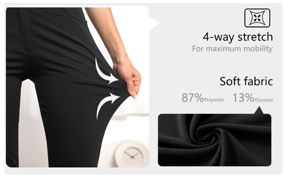 DRESS PANTS FOR WOMEN: (87%Polyester 13%Elastane) Belt loops, zipper fly with button, streamlined design, make these pants professional enough for business casual, work, office, yoga or golf.