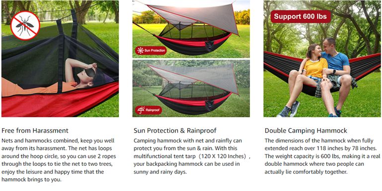 • ☀【Everything Included】: Our camping hammock set includes a Double Hammock with Net and Rain Fly(120*120 Inches), 2*10 Feet Tree Straps with 13 Loops(600 lbs), 2*D Shaped Steel Carabiners, 2*Net Ropes, 6*Guylines, 4*Aluminum Stakes, 1*Travel Pillow, 1*Eye Mask, 1*5 In 1 Survival Bracelet, 1*Pocket/Stuff Sack, 1*Installation Manual. No need to look elsewhere!