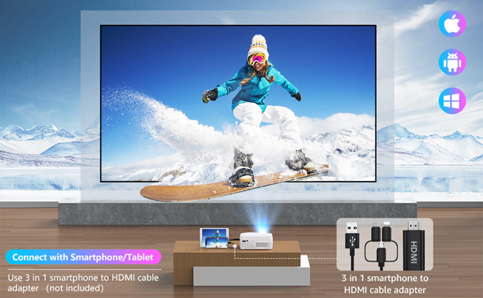 Equipped with HDMI, USB, TF card, VGA, and AV interfaces, Dxyiitoo projector supports the connection with TV Stick, Chrome cast, mobile phone, Micro SD Card,USB disk(No more than 32GB), Media players, for iPad, for iPhone, tablet, Android Smartphones.