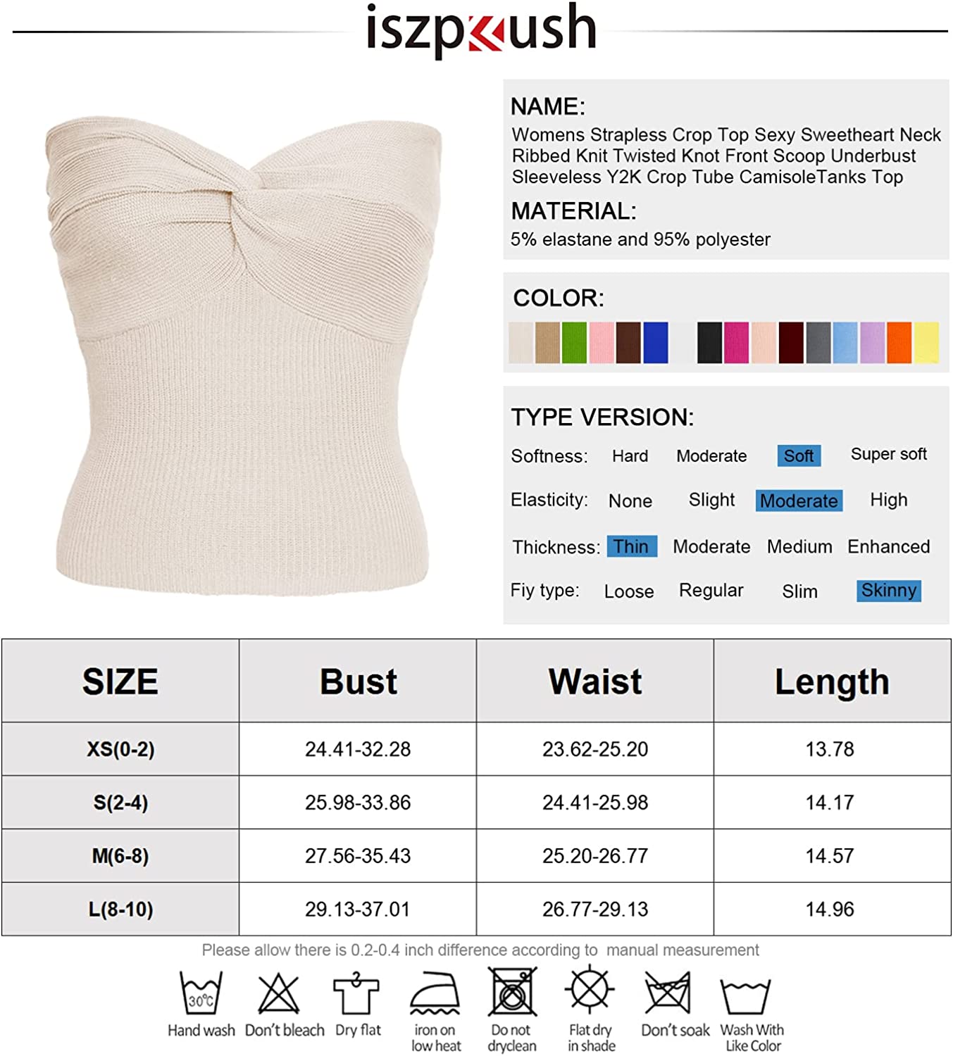 Womens Crop Camis Feature: Strapless, Sleevess, Twisted Knot Front,Ribbed Knit,Sweetheart Neckline,Scoop Underbust, Keep you trendy, flattering and eye-catching at any time and anywhere.