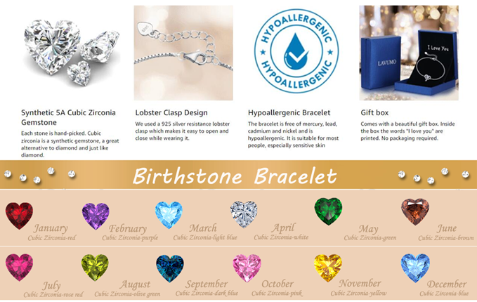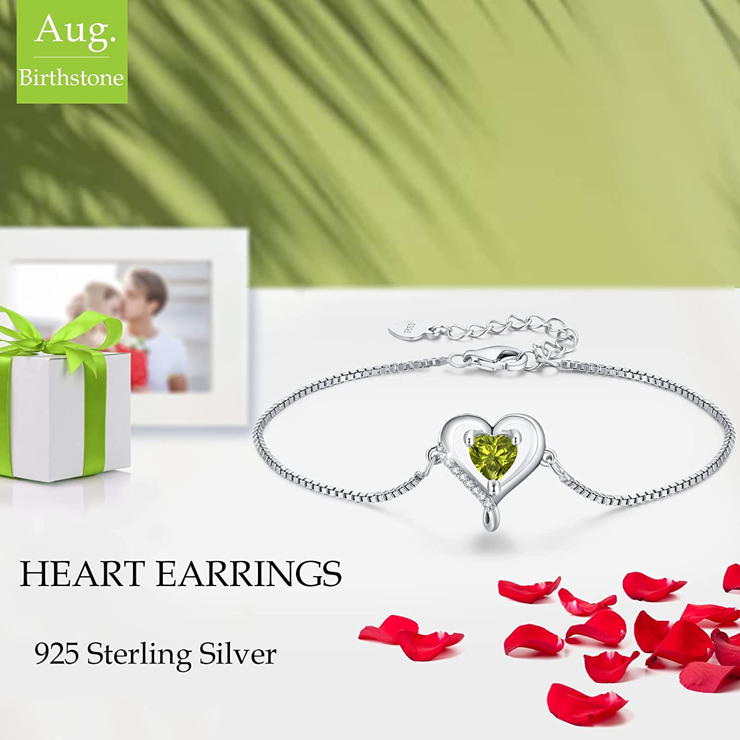 LAVUMO Heart Bracelet for Women 925 Sterling Silver Bracelet with Birthstone Zirconia,Adjustable Bracelet Best Mother's Day Gifts for Women Girls Chain Length 6.7"+1.6" Extend