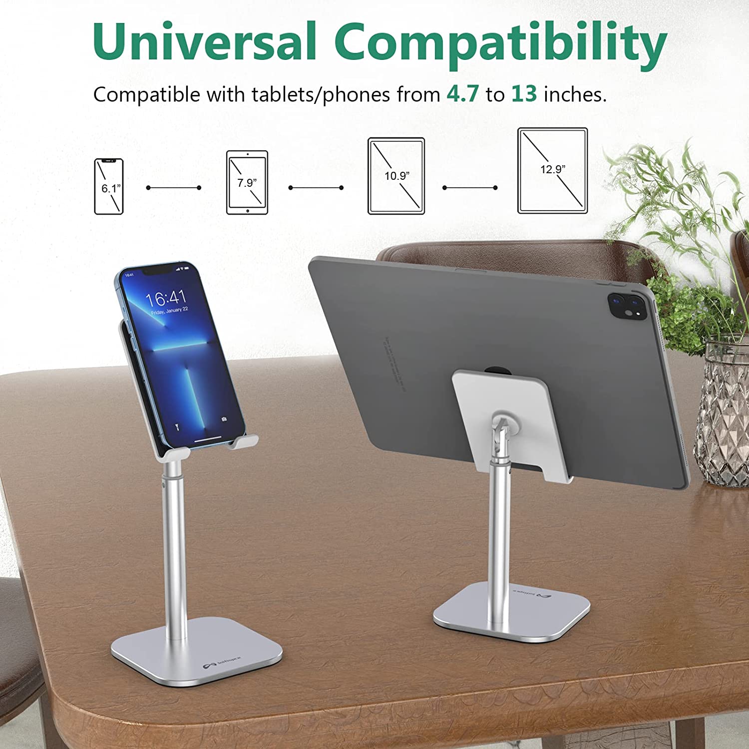 【Wider Compatibility】 Desktop tablet stand holder is compatible with 4.7''-13'' screen cellphones and tablets, Such as such as new 2020 iPad Pro 11 / 12.9, iPad Air 4, 2018 iPad Pro 9.7 / 10.5, iPad Air mini, Microsoft Surface Pro series, Kindle Paper white, Fire HD 7 8 10, E-reader, Samsung Galaxy Tab series and more.