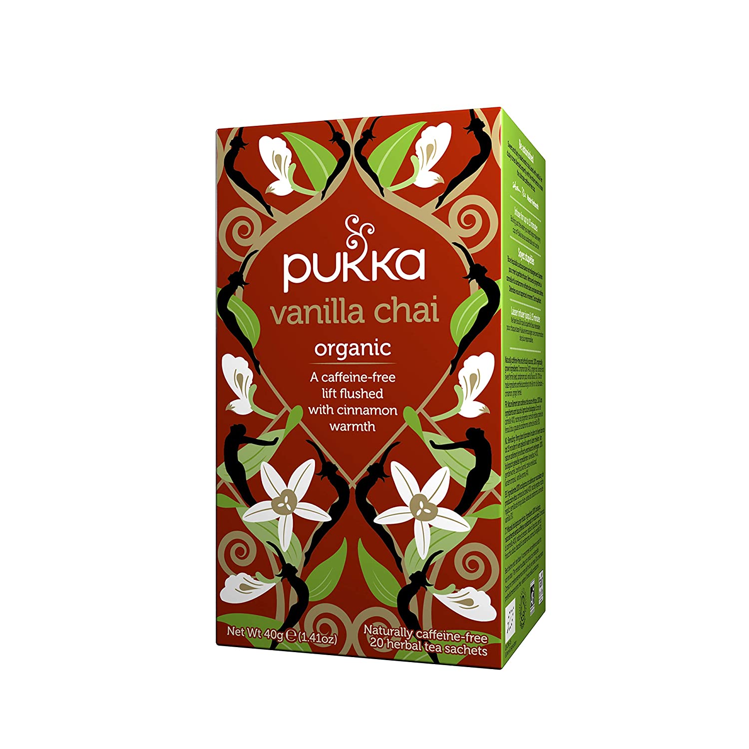 Pukka Organic Herbal Tea Vanilla Chai, a caffeine-free lift flushed with cinnamon warmth.