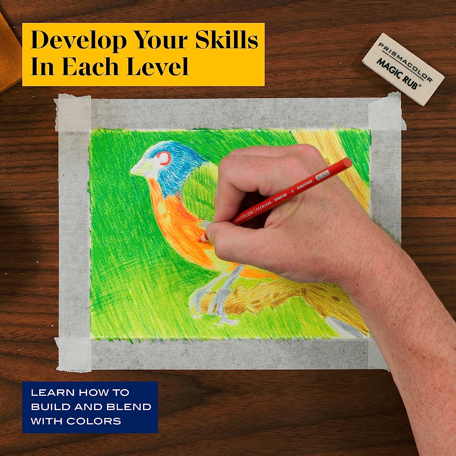 Learn art at your own pace from the comfort of home with Prismacolor Technique. Each Prismacolor Technique set features a unique coupon code for access to digital art lessons you can’t get anywhere else. Instructed by Prismacolor artists, each lesson will teach you how to use the professional-grade art supplies included in the set to create a piece of art you will cherish. The Level 2 Animal Drawing Set is designed for those who want to keep building on their art knowledge. You’ll practice color usage and style while creating a vibrant bird drawing. The set features Prismacolor colored pencils with rich cores for smooth color laydown and dual-ended markers that let you switch between broad coverage and fine lines. You’ll also receive an eraser, a drawing pad, graphite pencils, a mini sharpener, a drawing template, a set of instructions, and hours of online content to learn at your convenience!