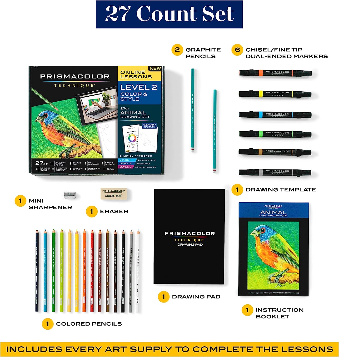 Prismacolor Technique, Art Supplies and Digital Art Lessons, Animal Drawings Set, Level 2, How to Draw Animals with Colored Pencils, Dual-Ended Markers, and More, Bird Drawing Lesson, 27 Count